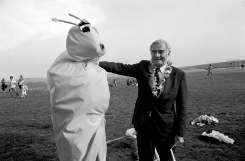 Students in a banana slug costume with Chancellor Robert Sinsheimer at the Banana Slug Spring Fair on the East Field